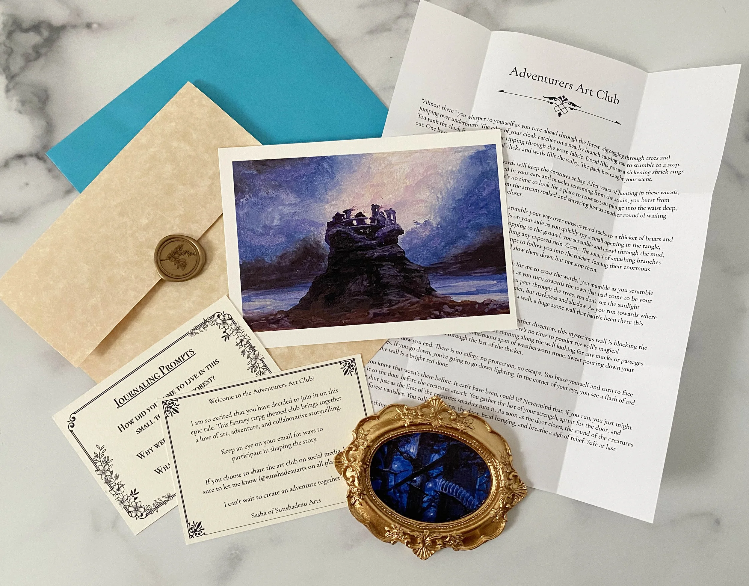 You'll get a brightly colored envelope in the mail each month with art prints, the story, and other goodies.